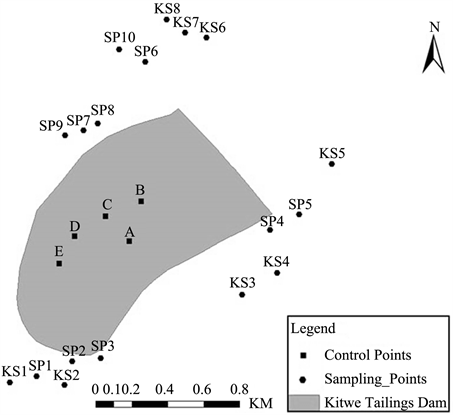 Figure 1. Map of study site showing the location of the Kitwe slimes (TD25) and the sampling points. (Note: SP1 - SP10 represents sampling points within 200 m, while KS1 – KS8 are sampling points within 400 m away from TD25).
