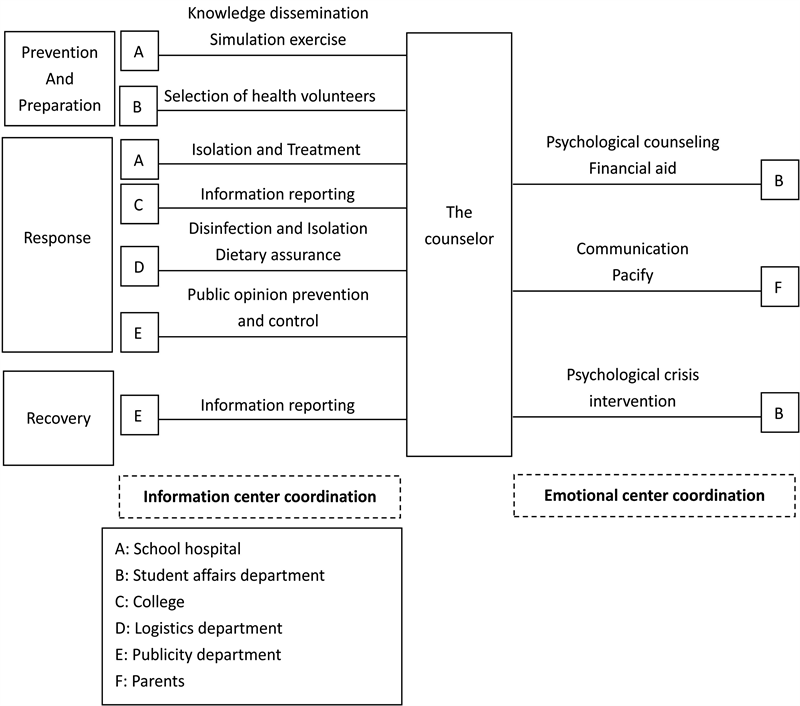 In the prevention and management stages, counselors mainly play the role of information center, coordinating with the school hospital to carry out public health safety knowledge lectures and simulation exercises for responding to sudden public health emergencies, and enhancing public health awareness and self-protection awareness of student groups. They also work with the student affairs department to select public health volunteers among students, provide specialized training, and reserve professional talents for emergency management.