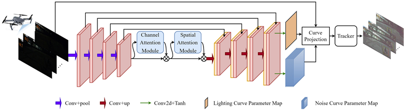 In order to estimate single illumination curve parameter map and multiple noise curve parameter maps, as shown in Figure 1, the improved approach based on Zero-DCE++ employs a convolutional neural network created by an encoder-decoder and introducing a channel-space attention mechanism. Then, it generates images with favorable illumination conditions by applying a comprehensive curve projection model. The approach illuminates the template and searching patches for trackers.