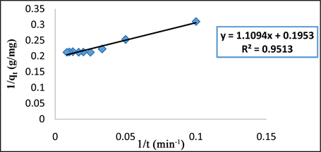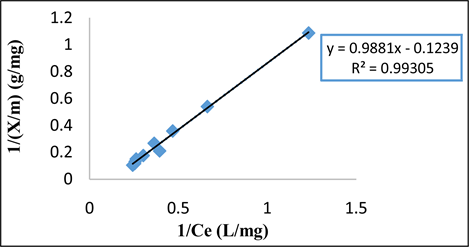 The equation has a correlation coefficient R2 = 0.9691. The linear representations of the experimental values of this adsorption process made it possible to determine the equilibrium parameters and the values of the Langmuir and Freundlich constants calculated by linear regression (Table 3).