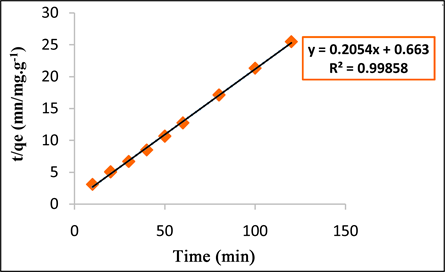 Figure 8. Modeling of the pseudo-second order adsorption kinetics of methyl violet (Mabs = 1 g, C0 = 50 mg/L, V = 100 mL and T = 27˚C).