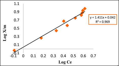 Figure 11. Methyl violet adsorption isotherms according to the Freundlich model. (Mabs = 1 g, C0 = 50 mg/L, V = 100 mL and T = 27˚C).
