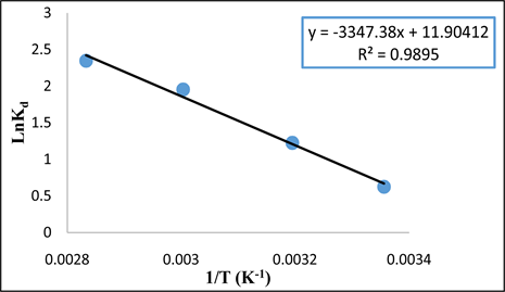 Figure 12. Effect of temperature on methyl violet adsorption distribution constant. (Mabs = 1 g, C0 = 50 mg/L, V = 100 mL and T = 27˚C).