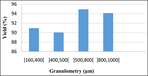 For the study of the effect of particle size adsorption rates greater than 90% are observed. The rate of removal of methyl violet is greater for particle sizes between 500 and 800 µm. The particle size between 500 and 800 µm is therefore considered to be the optimum adsorbent particle size with a removal percentage of 94.93%.