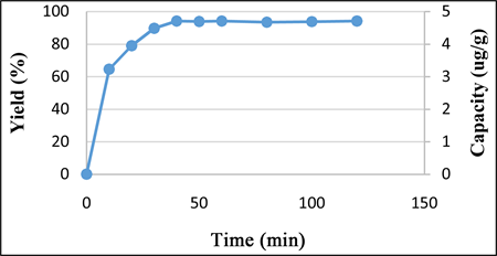 The results indicate that the removal rate increases progressively during the first 30 min (reaching 89.64% or a capacity of 4.48 mg/g) due to the availability of active sites on the surface of the adsorbent. , and slowly up to 40 min with a capacity of 4.71 mg/g and a dye removal efficiency of 94.18%, then stabilizes during the remaining time. The optimal contact time for our adsorption is 40 minutes.