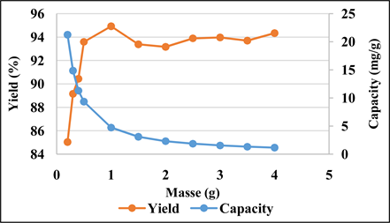 Figure 4 describes the evolution of the adsorption efficiency of methyl violet and the adsorption capacity of the material as a function of the mass of the adsorbent.