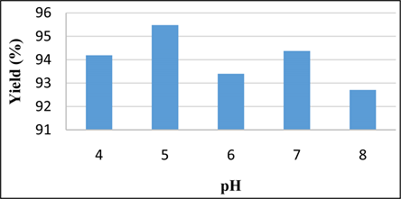 Figure 5 shows an increase in yield from 94.18% to 95.48%, respectively for the values of pH = 4 and pH = 5. According to the results observed, the removal of methyl violet is more appropriate in an acid medium.