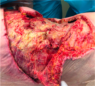 Five weeks later, the patient presented to the same medical facility with shortness of breath, altered mental status, right upper quadrant pain with cutaneous erythema, tachycardia (120 breaths/min), tachypnea (40 beaths/min) and hypotension (80/40 mmHg). The patient had leukocytosis of 15.1K. Repeat CAT scan of the abdominal and pelvis demonstrated a slight decrease in the size of the perihepatic fluid collection; however, the patient had evidence of ascending cholangitis, emphysematous cholecystitis, and necrotizing fasciitis-myositis extending from the right anterolateral chest wall down to the proximal right inguinal canal and over the right hip and flank. The patient was admitted, placed on broad-spectrum antibiotics, and emergently taken to the operating room for excisional debridement of the soft tissues including the skin and subcutaneous tissues of the right upper quadrant. Afterward, the patient was transferred to the author’s (MM) facility for continued surgical management which included multiple debridements, wound care, antibiotic administration, reconstruction, and eventual elective cholecystectomy.