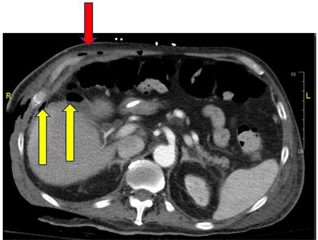 Figure 2. Image of computerized axial tomography scan of the abdomen showing free air in muscles of the right upper quadrant abdominal wall and a large right lateral thoracoabdominal flank defect (red arrow), fluid with intrabdominal air along the fistulous tract from the still retained gallbladder (yellow arrows), and a large right flank soft tissue defect.