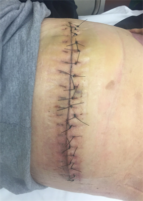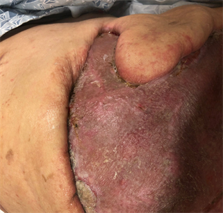 Figure 3. Photographic image by hospital day 25 prior to discharge: Right upper quadrant and flank, with split thickness skin graft coverage, with greater than 90% graft take.