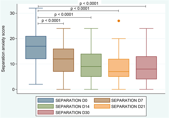 Analysis of the SRP assessment revealed a significant decrease in the overall score for each behaviour at different times. A statistically significant improvement in the frequency and severity of behavioral symptoms has been observed as soon as D7. The mean global SRP score decreased by 49% at D30 compared to the baseline. Comparing the baseline and final assessments, the percentage improvement for excessive barking, destructiveness, inappropriate urination, escaping and pacing were 48%, 62%, 72% and 60%, respectively.