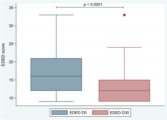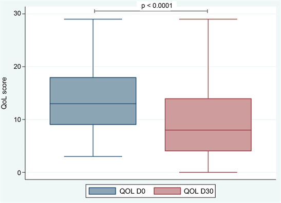Scores at D30 ± 2 were compared with the initial score (D0) using the Wilcoxon matched-pairs signed ranks test. Statistical significance was stated if P < 0.05.