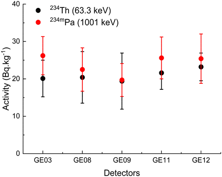 Usually, the activity of 238U in a sediment sample cannot be directly determined by gamma spectrometry since the 238U emits a weak gamma-ray at 49.55 keV (0.064%). However, its activity can be measured by means of its progeny 234Th (63.3 and 92.5 keV) and 234mPa (1001 keV) as both are reached in secular equilibrium with 238U in ~120 days in a closed system due to their short half-life. 234Th at 63.3 keV (4.5%) peak is a cleaner peak and suitable for 238U analysis. However, the 92.5 keV peak is a doublet consisting of 92.37 (2.61%) and 92.79 keV peaks (2.58%) and is affected by several other peaks i.e., 231Th X-ray (0.42%), 214Bi X-ray (0.083%), 228Ac X-ray (3.19%) and 235U X-ray (5.56%). Due to these interferences, the use of the 92.5 keV peak for directly quantifying 234Th is not possible and we use the 63.3 keV peak for 234Th determination. Another possibility is the use of 234mPa at the 1001 keV gamma line. The weak intensity of the 234mPa gamma line (1001 keV; 0.837%) in conjunction with the low efficiency of HPGe detectors at higher energies, often leads to a non-detectable peak in sediments. However, the 1001 keV peak does not have any interference with any other peaks and is not affected by self-absorption ( Yücel et al., 1998 ), hence this peak is useful to determine the 238U concentrations in the sediment samples. However, analysis of 238U by 1001 keV gamma peak requires a long-integrated counting time. By using our low background gamma spectrometers (GE03, GE08, and GE09) and ultralow background spectrometer (GE12), we can easily determine the 238U by using 234mPa, 1001 keV peak accurately. The 238U activity in the sediment sample by using 234Th (63.3 keV) and 234mPa (1001 keV) peak is presented in Table 4 and plotted in Figure 5. The 234Th and 234mPa activities in the sediment sample give very similar results within the measurement uncertainty among all five HPGe detectors. The 234Th activity varies from 19.4 ± 7.5 Bq∙kg−1 to 23.2 ± 3.7 Bq∙kg−1 and 234mPa activity varies from 19.7 ± 4.4 Bq∙kg−1 to 26.2 ± 5.1 Bq∙kg−1 among the detectors. The large uncertainties and the variation in radionuclide activities are due to the low emission probability of 3.70% ± 0.04%