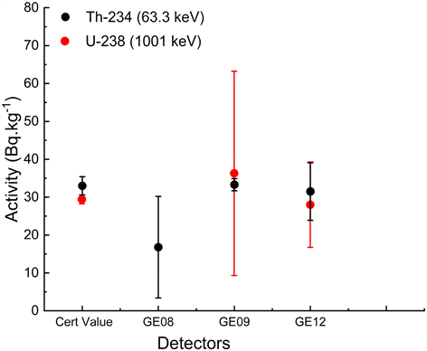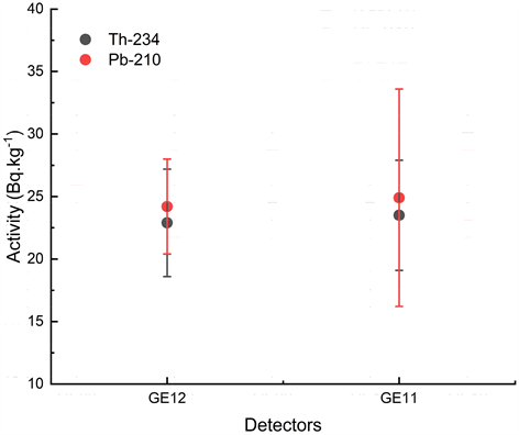 40 keV which is not a good choice for low-energy gamma detection. The precision of the 234Th activity measurement is good in all five detectors, however, the GE12 HPGe ultralow background detector is the better choice for 238U measurements due to its low uncertainty. The mean gamma activities of 234Th and 234mPa are 20.9 ± 2.5 Bq∙kg−1 and 23.9 ± 2.5 Bq∙kg−1 respectively and the ratio of 234Th/234mPa is 0.87 ± 0.16 which shows that 234Th and 234mPa are in secular equilibrium with 238U.