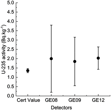 2.0 ± 1.8 Bq∙kg−1, 1.85 ± 1.3 Bq∙kg−1, and 2.03 ± 0.6 Bq∙kg−1 which agrees with the certificate value of 1.36 ± 0.11 Bq∙kg−1 (95%) confidence interval is (1.24 – 1.51 Bq∙kg−1) as shown in Figure 11. The certificate value of 235U activity is based on the 16 measurements either by Alpha Spectrometry or ICPMS. Our measured activity values of 15.3 ± 0.5 Bq∙kg−1, 15.1 ± 0.5 Bq∙kg−1, and 15.8 Bq∙kg−1 on GE08, GE09, and GE12 HPGe detectors for 137Cs do not agree with the certificate value of 19.8 ± 0.6 Bq∙kg−1 presented in Table 5, however, our 137Cs activity results show good agreement and precision among three detectors. To validate our 137Cs results further, we used a PT soil sample from IAEA-CU-2006-03 World-Wide Open Proficiency Test on the Determination of Gamma Emitting Radionuclides ( Shakhashiro et al., 2007 ). Our laboratory participated in this PT exercise in 2006. Soil sample from the 2006 PT batch was analyzed for this study on GE08 and GE12 for 60000 s and the results agree with the PT value (Figure 12). The results of the Certified Reference Material IAEA-385 sediment and 2006 IAEA PT soil sample show the accuracy and precision of NCL’s low background gamma measurement capability for measuring radionuclides in environmental samples, particularly for 238U and 235U.