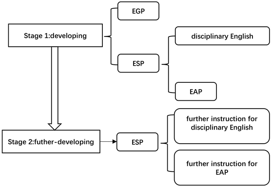 English Syllabus for Non-English-Major Postgraduate Students in China (2020) has divided the whole process of postgraduate English teaching into two stages: developing and further-developing (see Figure 1). English for General Purposes (EGP) and English for Specific Purposes (ESP) are included in the developing stage. EGP is utilized to strengthen students’ English ability in listening, speaking, reading, writing, etc., serving as a transition course for students to be prepared for more advanced English studies. ESP consists of disciplinary English and EAP. Disciplinary English, usually delivered by teachers with an educational background of the same discipline (as the students being taught), tends to teach vocabulary and expressions specific to certain discipline; while EAP is normally linguistic education from the angle of linguistic analysis, managing to satisfy postgraduates’ needs to participate in academic activities. EAP is normally taught by teachers with educational background of foreign languages (Wang, 2022) . For the further-developing stage, EAP is taught more deeply (Zhao & Chu, 2023) . As an important part of EAP, EAP writing hasn’t been grasped thoroughly for Chinese postgraduate students according to some scholar’s research (Wang, 2018) .