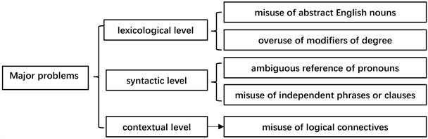 1) Figuring out major problems in postgraduate students’ EAP writing. Pinkham (2000) has summarized problems often found in Chinese writers’ and translators’ works. Based on these problems, together with the researcher’s pilot investigation, 5 major problems falling into 3 categories (lexicology, syntax and context) can be found in Chinese postgraduate students’ EAP writing. They are as follows (also see Figure 2).