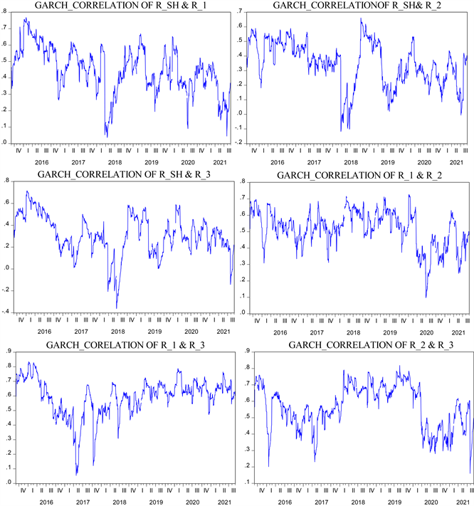 Below we use the DCC-GARCH model to examine the correlation between the Shanghai Composite Index (R_SH) and the three stocks (R_1, R_2, R_3). Here, the conditional variances are set to GARCH (1, 1) form, and the order of the DCC model is also set to 1. The estimated results of each parameter of the model are shown in Table 7. From the DCC model parameter estimation results obtained in Table 7, α and β are significantly different from zero, indicating the influence of the standardized residual product of the lagging period on the dynamic correlation coefficient, and β is not only significant but also very close to 1, reflecting correlation has a very strong persistent characteristic.