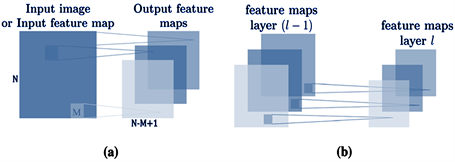 Figure 1. Convolutional and pooling layers producing feature maps. (a) convolutional layer; (b) pooling layer.