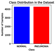 First Figure 5 displays an initial dataset with a class imbalance with a lower count of “NORMAL” (blue bar) compared to “PNEUMONIA” (red bar) while the second 6 shows the dataset after employing CGAN to synthesize images for the “NORMAL” class, achieving an equal number of samples for both classes, thus rectifying the imbalance and facilitating the training of more accurate and unbiased diagnostic models (Figure 6).