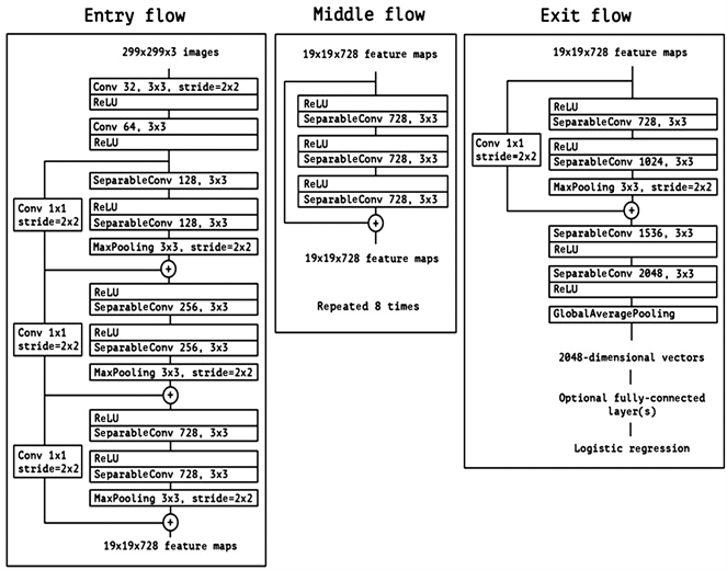 Figure 9. Architecture of the xception model showing entry, middle, and exit flows.