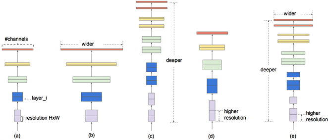 Figure 10. Model Scaling. (a) is a baseline network example; (b)-(d) are conventional scaling that only increases one dimension of the network width, depth, or resolution. (e) is our proposed compound scaling method that uniformly scales all three dimensions with a fixed ratio.