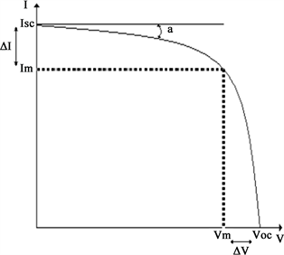 Various methods have been developed for the determination of Rs and Rsh [22] [23] [24] . In our study, The graphical method [25] is used for the evaluation of the series resistance Rs. In practice, the method consists in choosing two I-V curves at different illuminations but at the same temperature. The arbitrary choice of these two characteristics I-V is such that ΔI, which is the variation between the short circuit current Isc and maximum useful current Im, is the same for both characteristics (Figure 2).