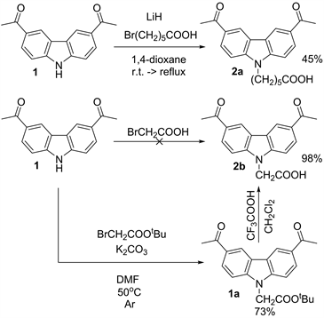 The carboxyl group with С5 spacer was introduced by the reaction of the diacetyl derivative 1 with 6-bromohexanoic acid in dry 1,4-dioxane in the presence of lithium hydride (Scheme 1). Compound 2a yields were not less than 45% after crystallization from ethyl acetate. The introduction of a shorter spacer С1 is more difficult and has to be achieved in 2 steps, as direct alkylation of diacetylcarbazole 1 with bromoacetic acid was unsuccessful under various conditions. Therefore, tert-butyl bromoacetate was used as the alkylating agent, giving the intermediate 1а. The subsequent cleavage of the tert-butyl group with trifluoroacetic acid yielded 79% of 2b.