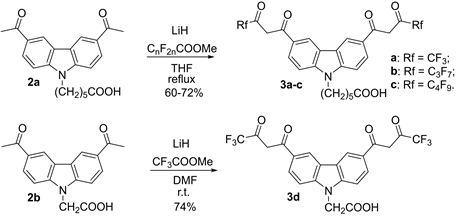 Compounds 3a-d were obtained by the Claisen condensation of perfluorinated carboxylic acid esters with diacetylcarbazoles 2а, b (Scheme 2). Three different perfluorinated fragments were introduced—CF3, C3F7, C4F9, as it seemed interesting to evaluate the effect of fluorinated substituents on the luminescent properties of the corresponding complexes. It is known that the introduction of perfluorinated fragments of various lengths can be utilized to regulate the hydrophilic-hydrophobic balance which sometimes has a strong influence on the spectral and luminescent parameters of tetraketones and their Eu3+ complexes [11] .