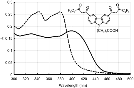 One of the ways to further increase the sensitivity and rapidity of the method is the search for aromatic β-diketones with enhanced spectral properties and improved stability. Previously studied carbazole compounds containing two β-dicarbonyl polyfluorinated fragments have satisfactory luminescence and increased stability of complexes by two to three orders of magnitude in comparison with conventional β-diketones [8] [9] . Earlier, we obtained a biomolecular labelling agent—a carbazole-based tetraketodiester with two methoxycarbonyl groups separated by difluoromethylene spacers from the chelating center [10] . The drawback of this marker is its bifunctionality that leads to “crosslinking” of protein molecules with the subsequent precipitation.