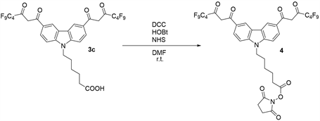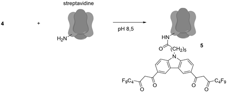 The conjugate was obtained using the complex of carbazole 3c, as its luminescence parameters are the most promising. Conjugation was performed in a model experiment with streptavidin after a preliminary activation of the carboxyl group with dicyclohexylcarbodiimide and hydroxybenzotriazole in DMF. The activated intermediate was not isolated and was added to streptavidin in buffer solution (Scheme 3 and Scheme 4).