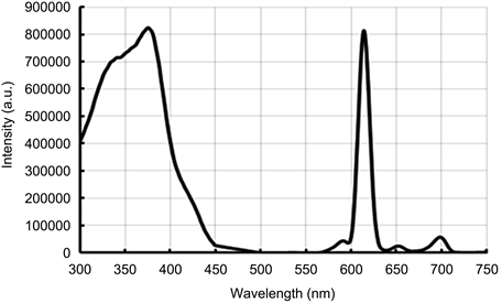 Figure 2. Excitation (left) and emission (right) spectra of the phosphorescent nanoparticles doped with Eu3+ chelate 3а (total Eu3+ content in the dispersion is 1.6 × 10−5 mol/L).