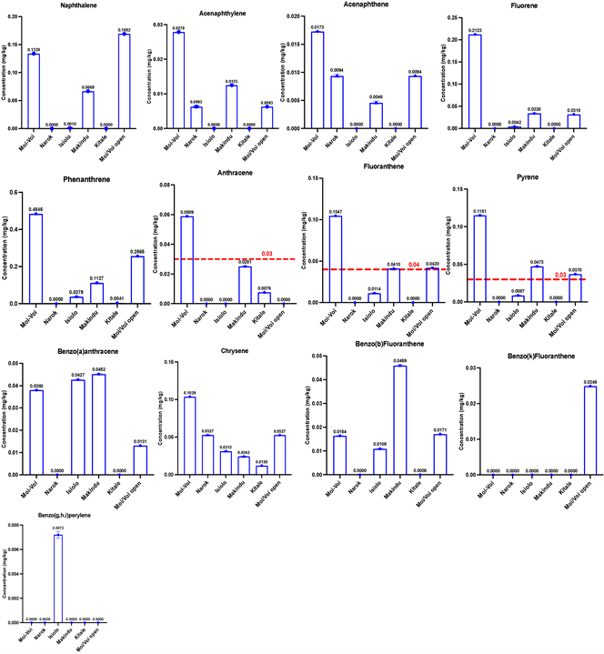 It was not detected in Kitale. Kitale also had the lowest concentration of phenanthrene at 0.0041. Narok and Moi/Voi (open) averaged at 0.2662 whilst Moi/Voi recorded the highest at 0.4845. Anthracene was not detected in Isiolo, Moi/Voi (open). Makindu, Narok and Kitale recorded concentration values of 0.0251, 0.0076, 0.0076 respectively, which are below the allowable limit of 0.03 [55] . Moi/Voi showed a very high concentration (0.1074) of fluoranthene, as compared to the other locations, which was also above the allowable limits at 0.03. Makindu and Moi/Voi (open) depicted values very close to the allowable 0.04 limit on the higher side i.e. 0.0410 and 0.0420 respectively. In all regions, pyrene was present with Moi/Voi having the highest value at 0.1151. Except for Isiolo (0.0087), all other region registered values above 0.03 (allowable limit) at 0.0473, 0.0370 for Makindu and Moi/Voi (open) respectively. For benz[a]anthracene, Makindu recorded the highest value at 0.0452. Moi/Voi (open) had much lower values at 0.0131 while Kitale’s and Narok’s were undetected. Chrysene was also detected in all regions. Leading at 0.1039 is Moi/Voi whilst Kitale had the lowest (0.0120). Makindu also showed the highest concentration of benzo[b]fluoranthene at 0.0459, as other regions averaged closely at 0.0164, 0.0161, 0.0109 and 0.0171 for Moi/Voi, Narok, Isiolo and Moi/Voi open. Kitale showed no readings. Benzo [k]fluoranthene was not detected in all regions except for Moi/Voi (open) at 0.0249. Except for Isiolo (0.0072), benzo[g,h,i]perylene was not detected anywhere else. All concentration values were recorded in mg/kg.