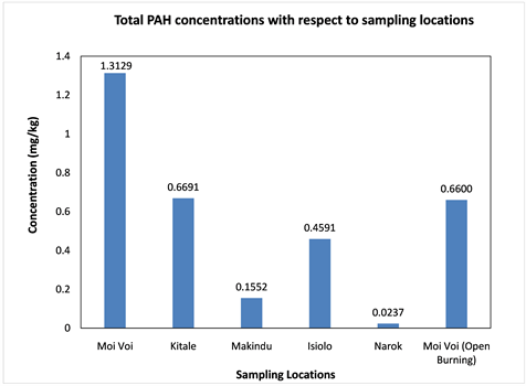 The total concentration of PAHs from the sampling locations are presented in Figure 5. Moi/Voi had the highest value at 1.3129 mg/kg followed by Kitale, Isiolo and Moi/Voi (open) 0.6691 and 0.4591, 0.66 mg/kg. Makindu and Narok had very low total PAHs concentrations at 0.1552 and 0.0237 as only 2 PAHs i.e. phenanthrene and anthracene were detected in Narok. These mean values are much lower than the ones observed in other literatures about concentration levels of PAHs in hospital waste incinerator bottom ashes. This could be attributed to the differences in the methodologies used for sample preparation and analysis, incinerator combustion parameters and also the dynamic nature of the waste composition acquired from each hospital [56] . Nevertheless, more studies should be done to ascertain the magnitude of the effect these factors and many others not captured herein have. A summary of the number of PAHs for each region is presented in Table 5.