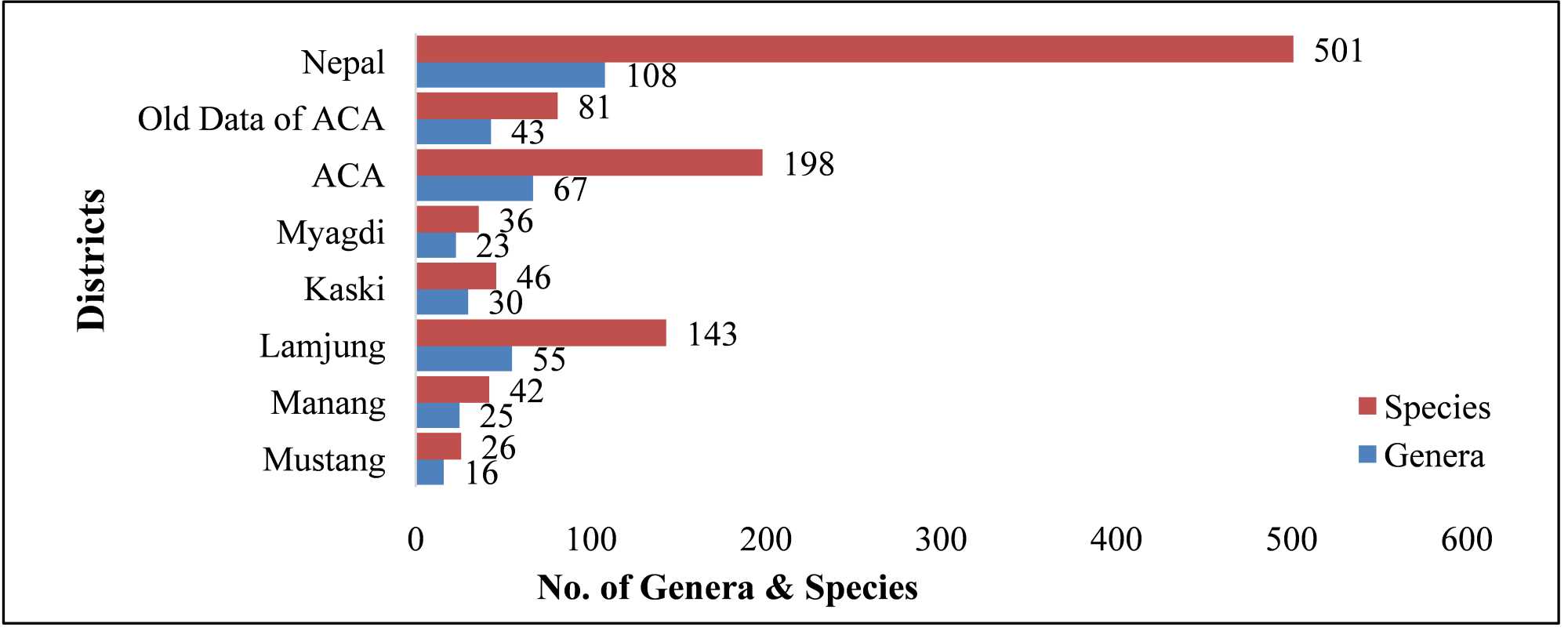 This study revealed that the ACA is the home to 198 species of orchids belonging to 67 genera, which make up 40 % and 62 % data of Nepal’s total orchid species and genera respectively. This data is 144% and 56% more than that recorded in the most previous study. Among these 67 genera, Bulbophyllum was the most dominant genera with 17 species, followed by Dendrobium (16), Heminium (10), Coelogyne, Plantanthera (9 each), Eria, Habenaria, Oberonia (8 each), Calanthe (7), Liparis (6), Cymbidium, Goodyera (5 each), Oreorchis, Peristylus, Pholidota (4 each), Crepidium, Cypripedium, Neottia, Neottainthe, Otochilus, Pleione and Zeuxine (3 each), and Aerides, Epipactis, Epipogium, Eulophia, Malaxis, Nervilia, Phalaenopsis, Satyrium, Spiranthes, Sunipia and Thunia (2 each). The rest of the genera comprised onlya single species. Of the five districts in the ACA, Lamjung district (UCO Bhujung) had the highest diversity of orchids, 55 genera and 143 species, followed by Kaski, Manang, Myagdi, and Mustang district respectively. Mustang had the least diversity of orchids, 16 genera and 26 species. The details of orchids are shown in Figure 2.