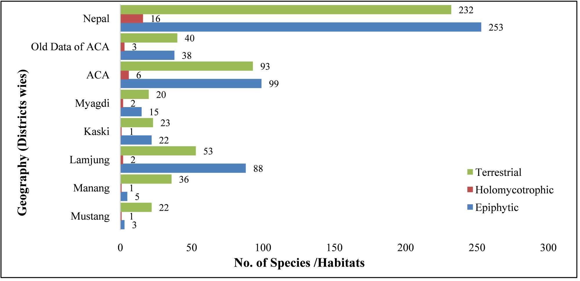 Similarly, in terms of habitat, only epiphytes, holomycotrophic, and terrestrial were considered. Out of the 198 species of orchids in ACA, 99 were epiphytes, 6 were holomycotrophic, and 93 were terrestrial. These represented 39%, 38%, and 40% of all orchids in Nepal respectively. In comparison to the previous study, epiphytes increased by 161%, holomycotrophic by 100%, and terrestrial orchids by 133% in this study. Within ACA, the largest numbers of epiphytic orchid species were recorded in Lamjung (88), and the fewest in Mustang (3). The largest number of holomycotrophic orchid species were recorded in Myagdi, and Lamjung (2 each) and the fewest in rest of district (1 each). The greatest number of terrestrial orchid species were recorded in Lamjung (53) and the fewest in Myagdi (20). Details on the distribution of orchids according to their habitat are given in Figure 3.