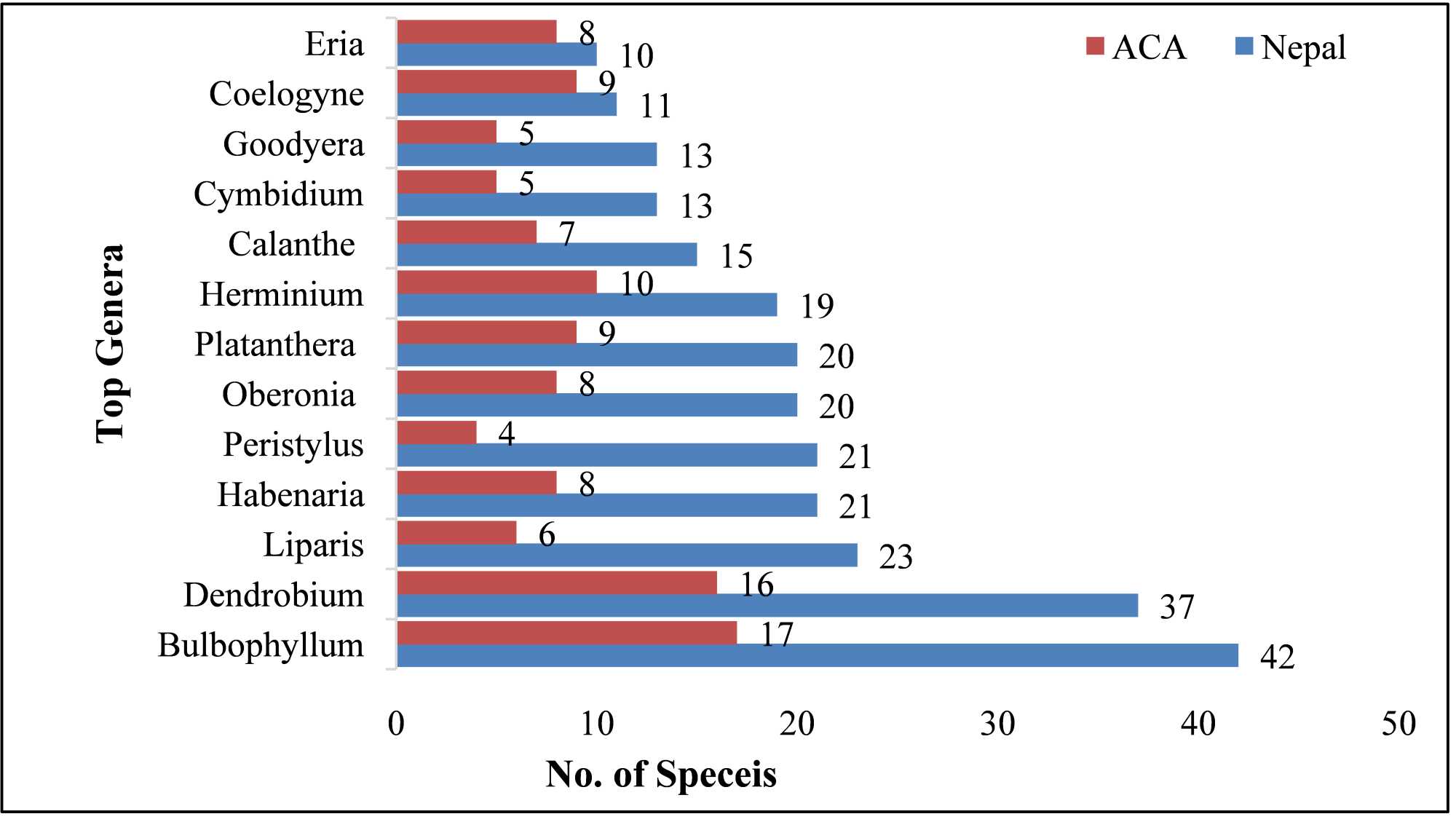 The comparative study of genera richness of orchid of ACA with national total had also carried out in reference to the recent publication [16]. The study shown that Bulbophyllum was found to be the richest genera both in national and ACA total i.e. 42 and 17 species respectively. However, Peristylus was recorded as the genera abided the least number of species in ACA while Eria in national total. The details of genera richness are show in the below Figure 4.
