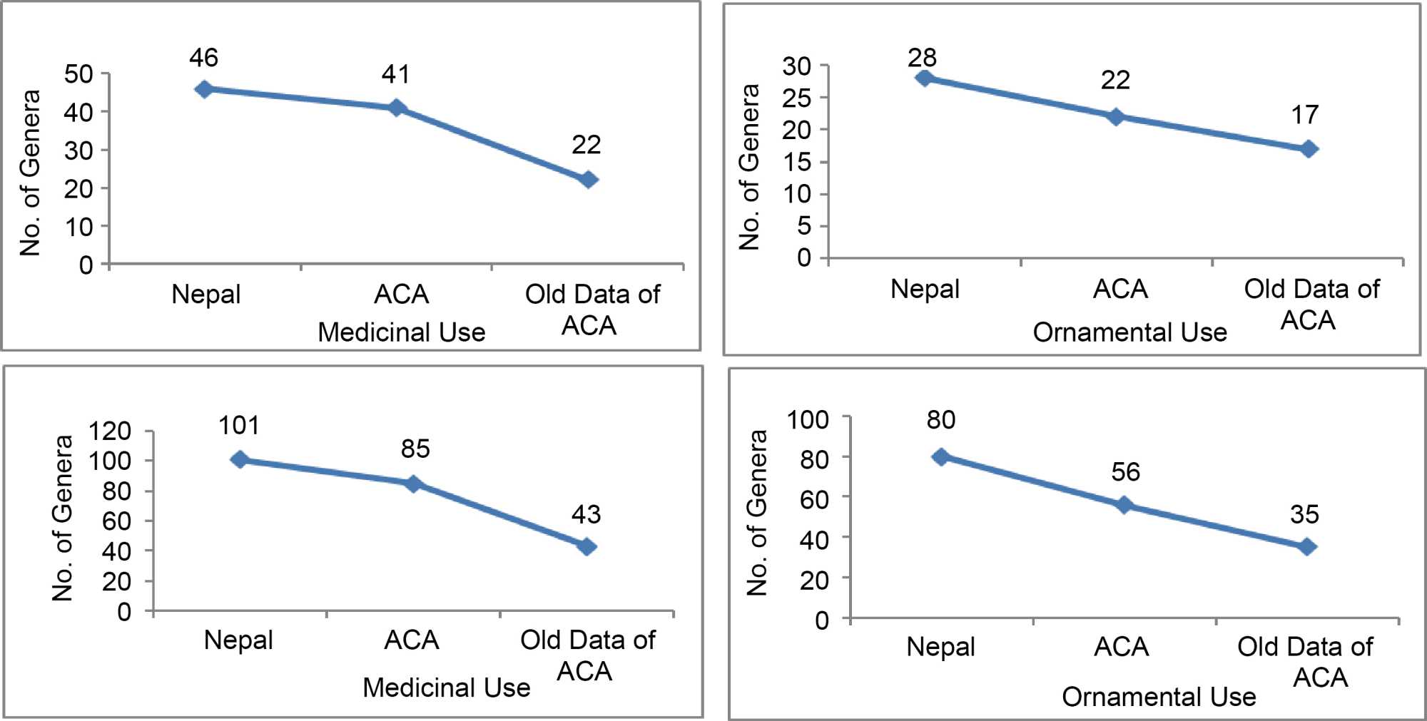 Orchids have been categorized into two major uses in the local and national contexts of Nepal: ornamental and medicinal. Among 67 genera and 198 species of orchids in ACA, 56 species belonging to 22 genera were ornamentally valuable. These figures represent 79% and 70% respectively of the national totals. Similarly, 85 species of 41 genera were used medicinally. These figures represented 84% and 89% of the national totals. In comparison with the old data, the numbers of genera and species increased by 29% and 60% respectively for ornamental orchids and 86 % and 98 % for medicinally used orchids. The details of the data are presented in Figure 5.