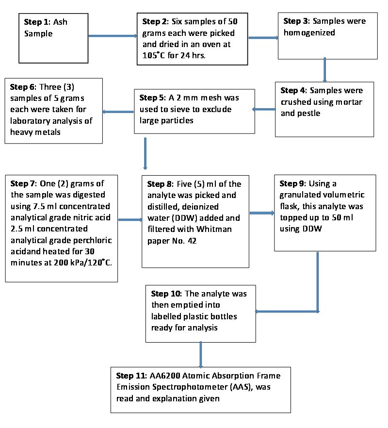 Six ash samples of 50 grams each were picked and dried in an oven at 105˚C for 24 hours after which the samples were ground and homogenised using mortar and pestle. A 2 mm mesh was used to sieve to remove debris; poorly burnt materials such as syringes, needles, glasses and scalpels after which 3 samples of 5 grams each were prepared and analysed as described in (USEPA, 2000). Portions of 2 grams each were weighed and added 7.5 ml concentrated analytical grade nitric acid (HNO3) and 2.5 ml concentrated analytical grade perchloric acid (HCL) for digestion and heated for 30 minutes at 200 kPa/120˚C. After this, five (5) ml of the analyte was picked and distilled, deionized water (DDW) added and filtered with Whitman paper number 41 using a granulated volumetric flask, and this analyte was topped up to 50 ml using DDW. After acid digestion, samples were left to cool and later transferred to a volumetric flask and topped to the 50 ml mark with DDW. This sample was emptied into labelled plastic bottles ready for analysis for Copper (Cu), Zinc (Zn), Lead (Pb), Cadmium (Cd), and Nickel (Ni) using AA6200 Atomic Absorption Frame Emission Spectrophotometer (AAS), and results read and explanation given. A laboratory prepared blank sample was also analysed (APHA, 1995). The analytical procedure followed the flow presented in Figure 1.