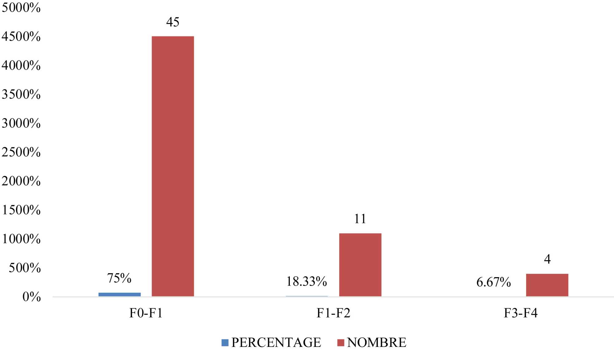 Mean hepatic elasticity was 6.7 KPA. Fibrosis was significant in 25% (n = 15) of cases. It was moderate (F1 - F2) in 18.33% (n = 11) and advanced (F4) in 6.67% (n = 4) (Figure 2).