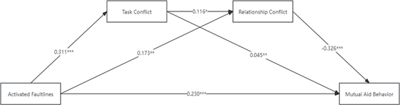 This study used regression analysis to test hypotheses H1, H2a, and H2b, Fault perception was a significant positive predictor of mutual aid behavior (β = 0.230, p < 0.001), hypothesis H1 was tested. Fault perception was a significant positive predictor of task conflict (β = 0.311, p < 0.001) and relationship conflict (β = 0.173, p < 0.01), respectively, and hypotheses H2a and H2b were tested. When fault perception, task conflict and relational conflict simultaneously predicted mutual aid behavior, fault perception and task conflict had a significant positive predictive effect on mutual aid behavior (β = 0.230, p < 0.001; β = 0.171, p < 0.01), whereas relational conflict showed a significant negative predictive effect with mutual aid behavior (β = -0.326, p < 0.001).