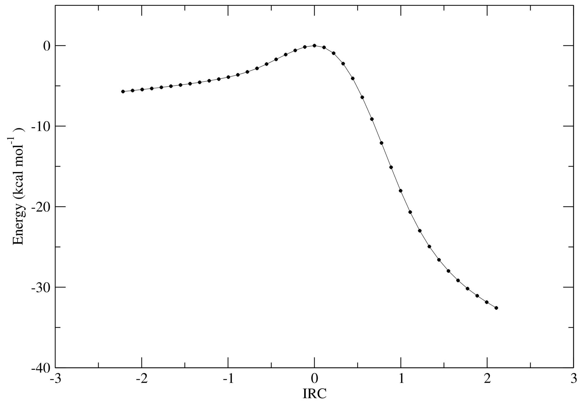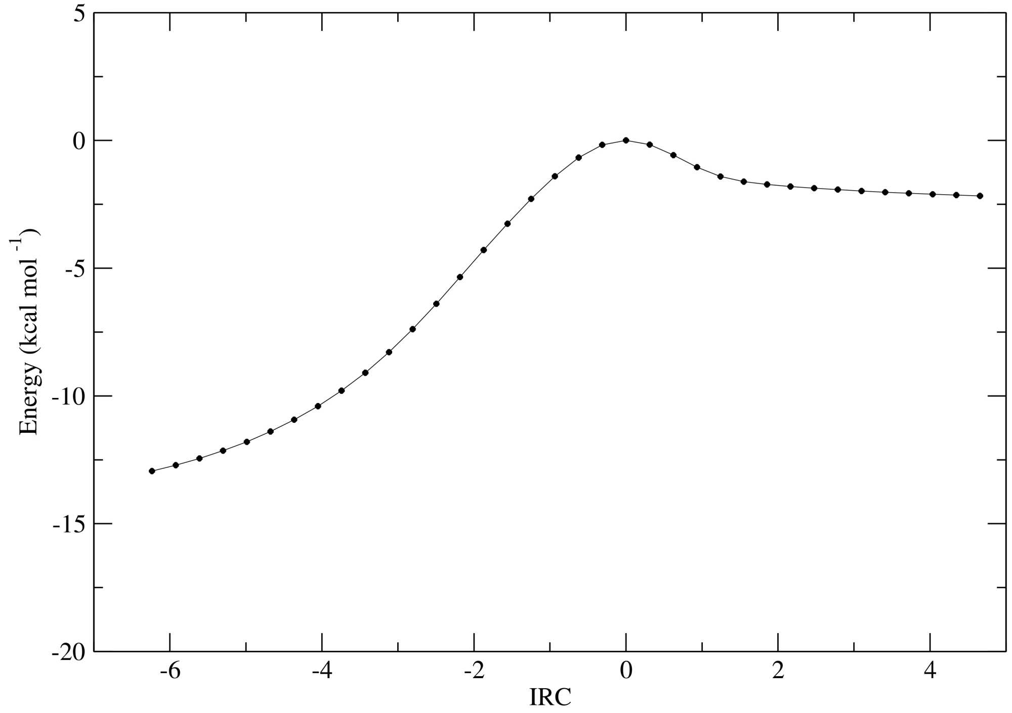 Figure S5. IRC pathway for TS2 of the reaction to obtain 3, using n-hexane as the solvent. Potential energies (kcal∙mol−1) relative to the maximum (TS2 energy).
