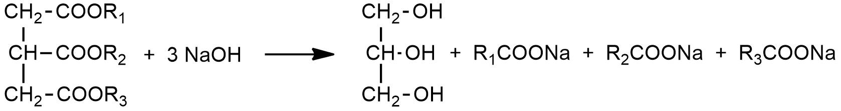 Saponification Index was determinate by indirect or reverse titration. 0.3 to 0.5 g of oil was added to a solution of 30 mL of sodium hydroxide and 20 mL of a mixture of 1:1 ethyl ether/ethyl alcohol. The latter allows dissolving the oil for a complete reaction with alkali. This solution was placed on a reflux heating assembly. The solution was heated to ∼150˚C for one hour from boiling. The equation of the reaction is: