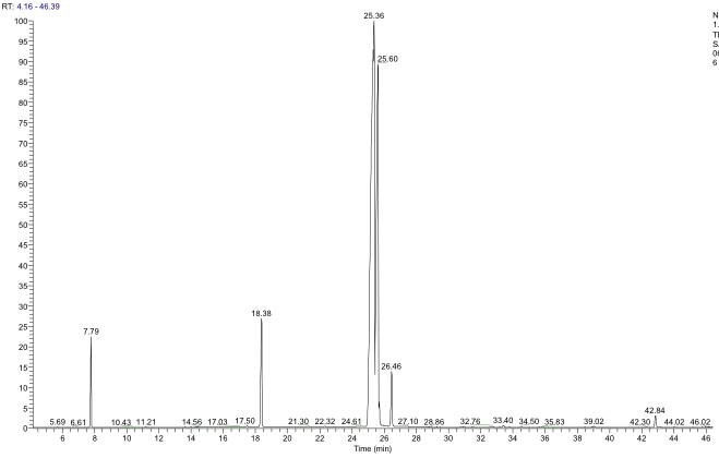 Chromatograms and mass spectra were obtained by using the GC-MS thermo scientific TRACE 1310 ITQ 1100 Ion Trap MS system. The column used was TG-SMS, 30 cm length and 0.25 mm diameter; the thickness of the layer of active substance was 0.25 μm. The CPG heating program was settled in 150˚C to 240˚C, with a temperature increase of 2˚C/min, the temperature stabilizes at 240˚C for 0.5 minutes, then it increases to 300˚C at a 7˚C/min rate until the temperature stabilizes at 300˚C for 2 min. The temperature in the injector was 250˚C, the flow rate of the carrier helium gas, was 1 mL/min.