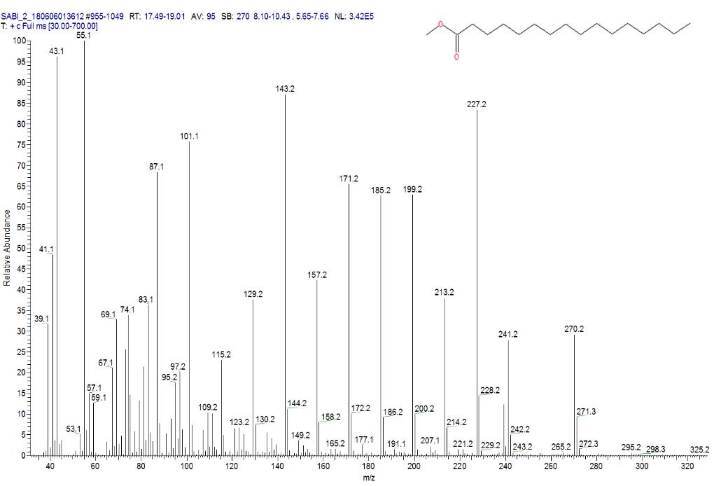 Figure 10. Mass spectrum of palmitic methyl ester (retention time 18.44 min).