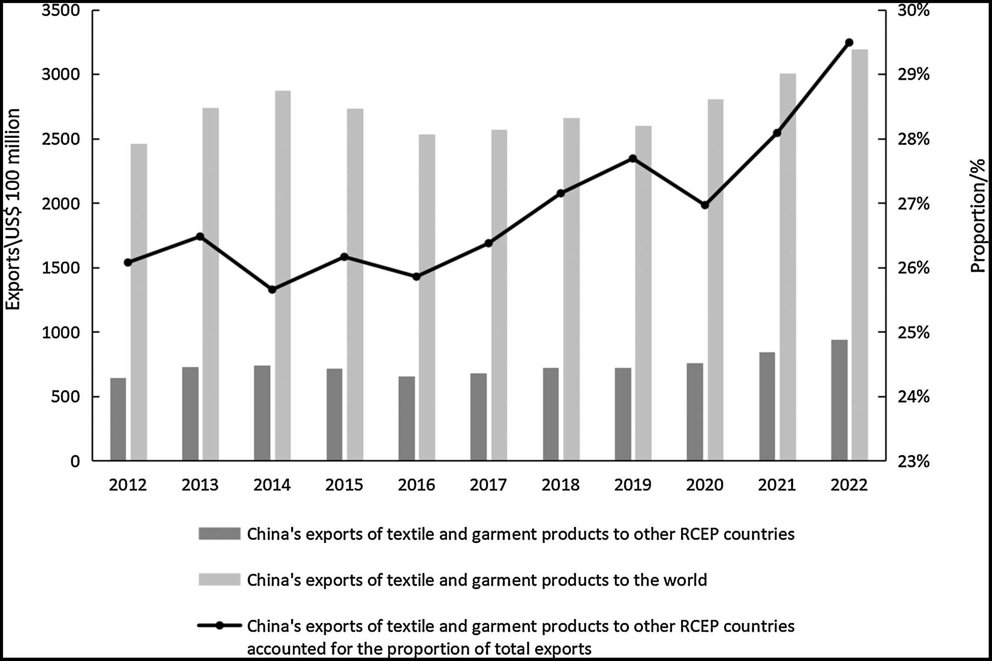 Figure 1. China’s exports of textile and apparel products to other RCEP countries and their proportion.