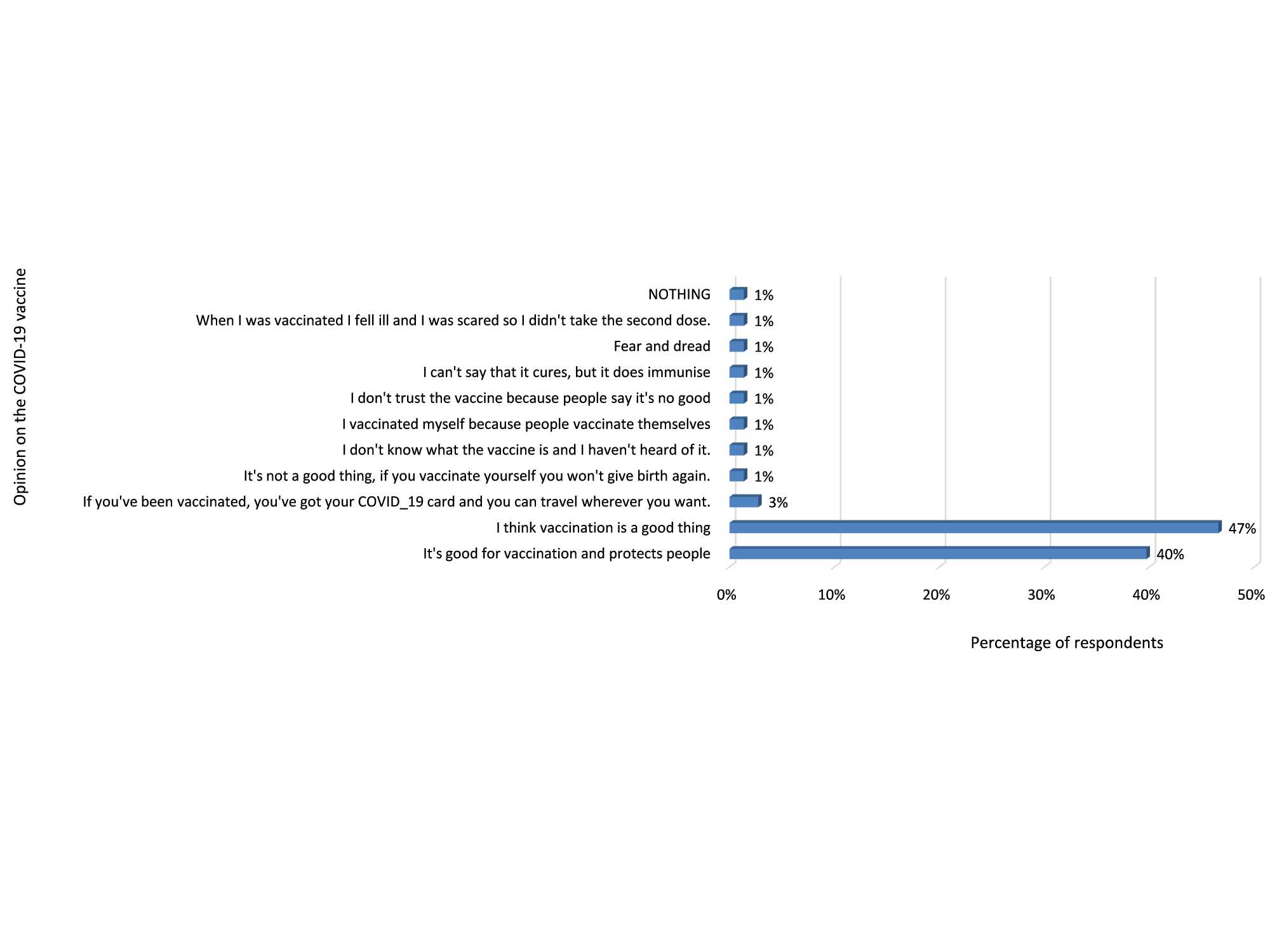 Our research examined a predominantly female population with low educational attainment, yet the majority were aware of COVID-19. They accessed information from various sources regarding both the disease and vaccination, with radio and television being the most prevalent. Over fifty percent of respondents reported being vaccinated, and they indicated that the distance to vaccination centers was not significant. The reasons for not being vaccinated were varied, including vaccine hesitancy and gender-related issues, such as requiring the husband’s approval before vaccination.