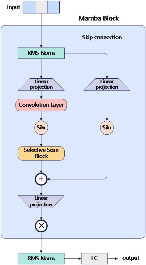 S6 (2024) [2] is a further improvement of S5, aiming to fully address the instability of SSM in deep learning training and provide stronger capabilities than the Transformer. Its computational diagram is shown in Figure 2. S6 introduces a selective mechanism that allows the model’s parameters (such as Δ, 𝐵, and C) to be dynamically adjusted according to the input. This mechanism enables the model to selectively propagate or forget information based on the current input, making it better suited for handling discrete modalities (such as text) and tasks requiring content-dependent reasoning. S6 also incorporates hardware-aware computational optimization techniques such as Parallel Scan and Activation Recomputation. These techniques allow S6 to run efficiently on modern hardware such as GPUs, significantly improving computational efficiency. The computational complexity of S6 is linear with respect to the sequence length O(N), much lower than the quadratic complexity of the Transformer. S6 is a core component of the Mamba architecture, and the Mamba network consists of multiple stacked Mamba basic modules. The structure of the basic Mamba block is shown in Figure 3.
