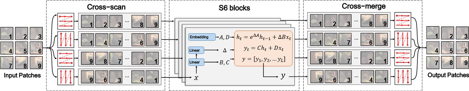 Selective Scanning: Each patch sequence is then processed in parallel through individual S6 blocks. The S6 blocks dynamically adjust based on the input image features, selectively propagating and forgetting information. This step enhances feature extraction capabilities while improving efficiency by parallel computation.