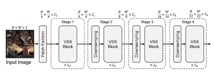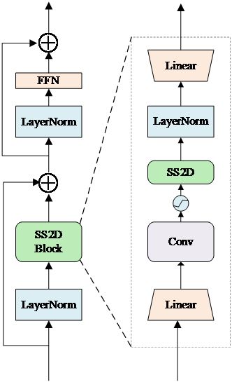 the VSS block structure. Its effectiveness in image feature extraction has been demonstrated. The Mamba network combines the advantages of CNNs and Transformers, allowing for global modeling of data while effectively addressing long-range dependencies, leading to better performance in image-related tasks.